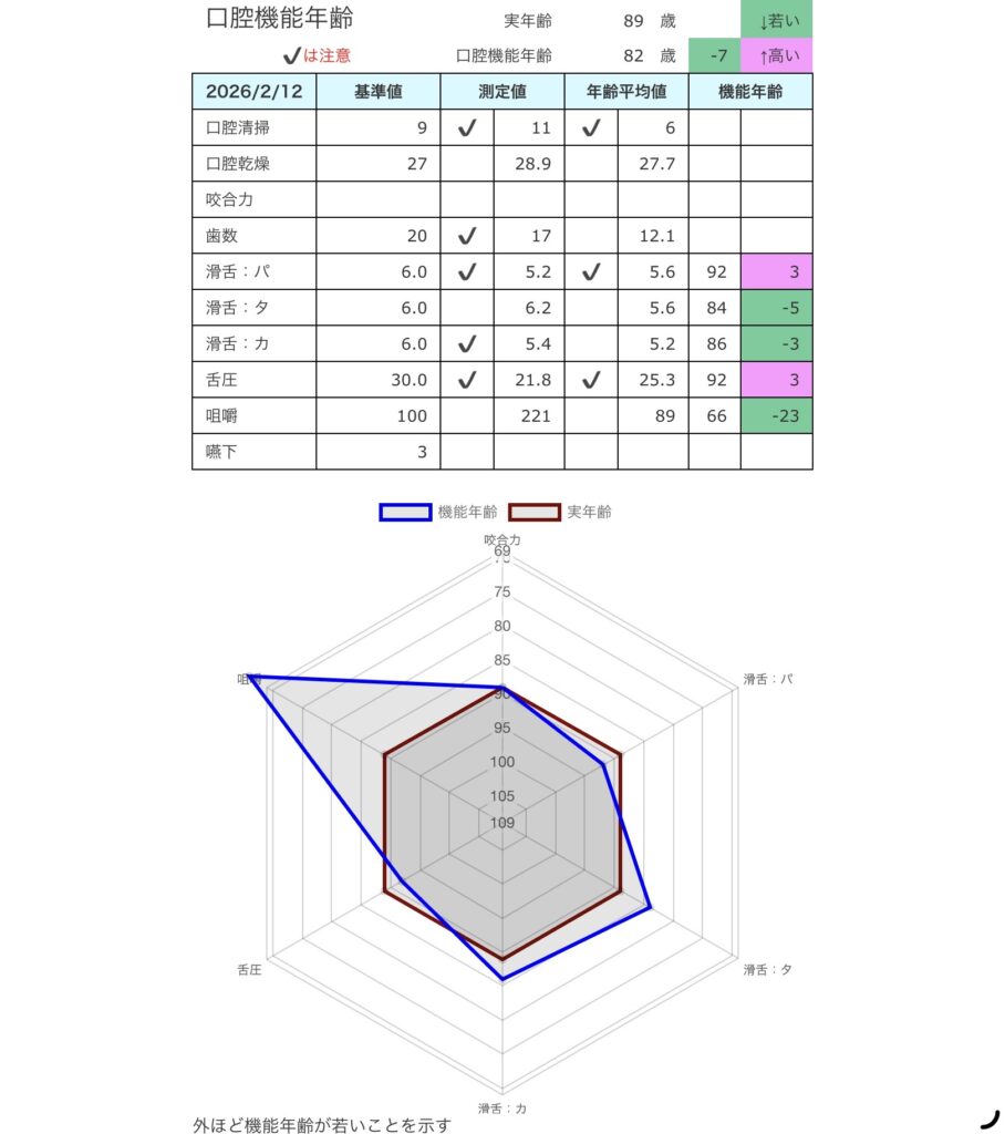 咀嚼の機能年齢が66歳で23歳も若い結果が出たので喜んで帰られました。